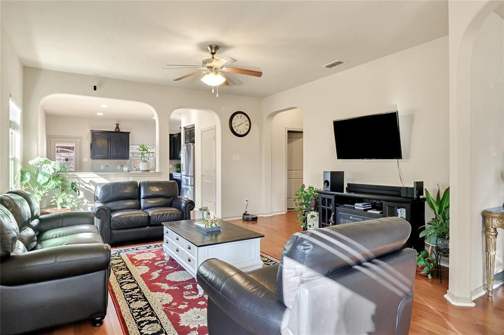 Charming 3-bedroom, 2-bath residence situated on a street that leads to a cul-de-sac. The living room is generously sized and connects seamlessly to the kitchen and breakfast nook. The master suite includes a separate shower, garden tub, dual vanities, and walk-in closet. The kitchen is equipped with an island and a breakfast bar, providing access to the backyard patio. The formal dining area is divided by a wall, making it an ideal space for a game room or home office. The covered patio allows for grilling in any weather and enjoying morning coffee. Backyard has walk way to gardening area. Owners replaced side fences and added gutters prior to March 2024. They replaced carpet and added engineered wood flooring in July of 2025, and replaced dishwasher and oven in July of 2025.