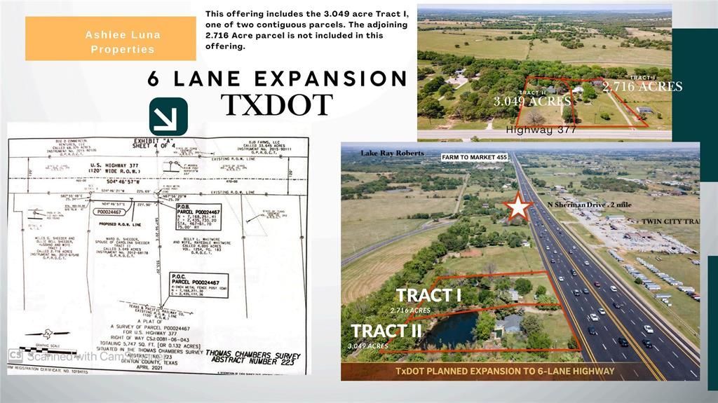3.049 +- Commercial Eligible Acres with over 225 feet of Highway 377 frontage. Now available for the first time in over 50 years, positioned directly in the path of opportunity. Not located in Flood Zone and Outside City Limits. East facing Prime location with immediate proximity to N. Sherman Drive, FM 455, Springhill Road and US HWY 380 known as the North Texas most active Commercial Corridors. This offering includes the opportunity to acquire the 3.049 acre tract, one of two contiguous parcels. The adjoining 2.716 Acre parcel is not for sale at this time and not included in this offering. Currently zoned residential this rare property is surrounded by expanding infrastructure and ongoing residential development, this location offers both immediate access and long term upside for investors, institutional assembly and commercial users. With planned TXDOT 6-lane highway expansion, this property is set to benefit from increased traffic counts, enhanced visibility and long term commercial viability. New owners will receive the eminent domain compensation from TXDOT partial acquisition which consists of. approx 5,7678 sq ft. As infrastructure drives development, sites like this become key anchors for future retail, service or mixed use projects to cater to the surge of new residential development. Structured with a one-year lease back to Seller this income producing property has a residential 4 bedroom 3 bath with recreation room single family home or office and propane heated pool. Well-suited for an owner-operator looking to establish a flagship presence. Buyers are encouraged to conduct independent due diligence to verify all information. Owner occupied. This property is subject to eminent domain. Information uploaded in transaction desk Please contact Listing Agent Ashlee Luna for additional questions or to schedule a tour. Survey available.
